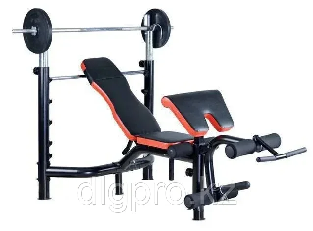Стойки под штангу с замками безопасности, имеют регулировку по высоте. Рычаги блока для ног снабжены мягкими валиками.